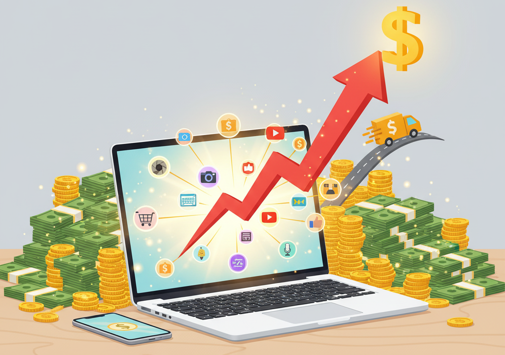 تُعد التجارة الإلكترونية، بجميع أشكالها (البيع بالتجزئة، الدروبشيبينغ، بيع المنتجات الخاصة)، هي المصدر الأغنى لجمع الثروات الرقمية. القوة هنا تكمن في القدرة على بيع المنتجات لجمهور عالمي دون الحاجة إلى متجر فعلي.